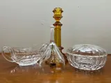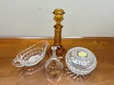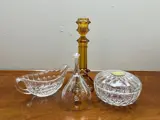 Vierdelig lot van Val Saint Lambert glazen/kristallen items. De amberkleurige art deco kandelaar is ontworpen door Charles Graffart voor de catalogus van 1935 (onderaan gemerkt). De tafelbel en de bonbonnière hebben gave stickers. Het kannetje is (als enige) niet gemerkt.