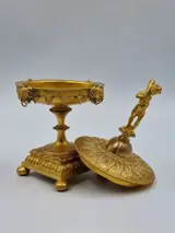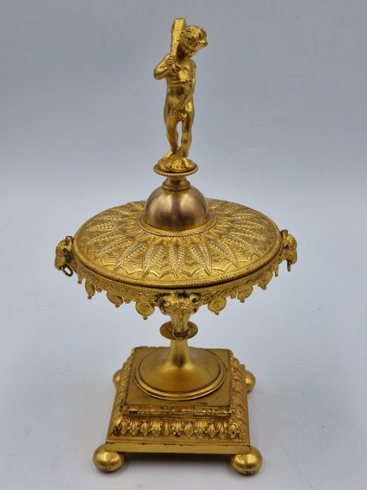 Bijzonder curieus kleine vergulde tazza met deksel. Decor mix van Neo stijlen