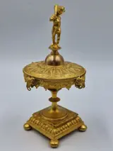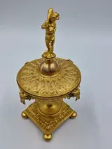 Bovenop het deksel een Cherubijn. Rondom rammen met een ring door zijn neus. Verkeert in een mooie staat zonder beschadigingen maar met normale gebruikerssporen behorend bij de leeftijd. Zie hiervoor de foto's.
