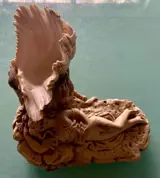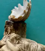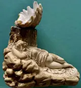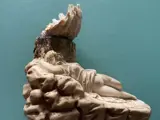 Een gipsen vide poche in de vorm van een slapende jonge vrouw op een rotsachtige ondergrond.