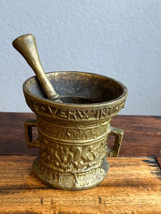 De kleinere vijzel heeft de tekst "anno 1590" en "LEEFTE VERWINT AL DINCK" weegt 1 kilo, is 8cm hoog met een diameter van 8cm. Zie de foto's om de patina en staat te zien.