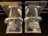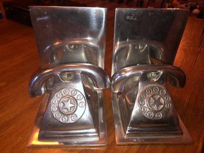 Mooi paar stijlvolle aluminium boekensteunen, nog in goede staat. Het thema is de telefoon, we kunnen een ster onderscheiden in het midden van de wijzerplaat.