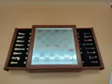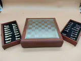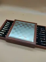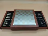 Prachtig schaakspel van glazen spiegeldoosbord met een afmeting van circa 20x20cm koning 5cm (let op 1 pion ontbreekt). Gecertificeerde verzending. Zoals foto's.