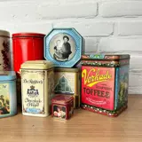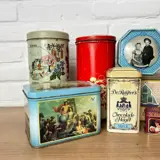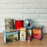 8 verschillende oude opbergblikken, waaronder een Verkade blik, beschuitblik van Arks met borduurwerk motief en andere vintage / brocante stijlen. Allen in goede vintage stijl, paar kleine deukjes, zie fotos voor buiten en binnenkant impressie.