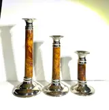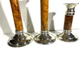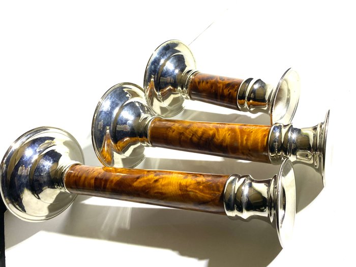 Elegante kandelaars ontworpen in de art deco-stijl, Puiforcat-stijl - maar ik kan geen signatuur vinden.Het metaalwerk had gladde oppervlakken en was gebaseerd op de geometrische reeks van verschillende materialen en kleuren.