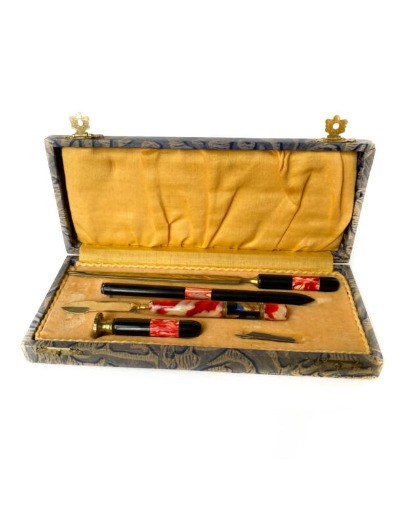 Bestaande uit kroontjespen, briefopener, mesje, lakstempel.