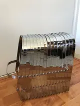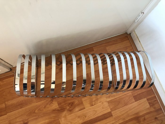Een uitschuifbare tijdschriftenhouder uit 1978 gemaakt van chroom van Luther Evans. De conditie is goed met lichte sporen van gebruik en veroudering.