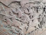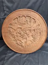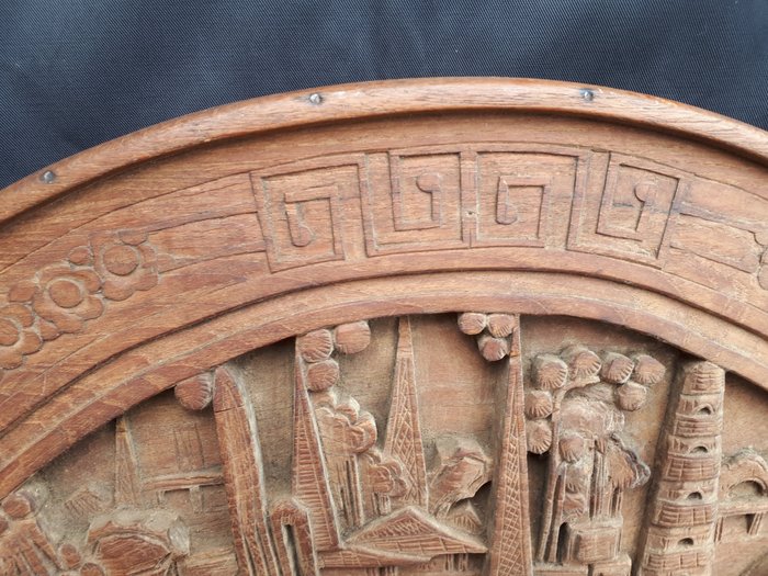 Unieke grote gesculpteerde houten wandplaat met strijdende krijgers, periode 19e eeuw in mooie antieke staat. Foto's maken deel uit van de beschrijving.
