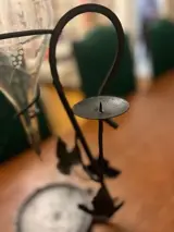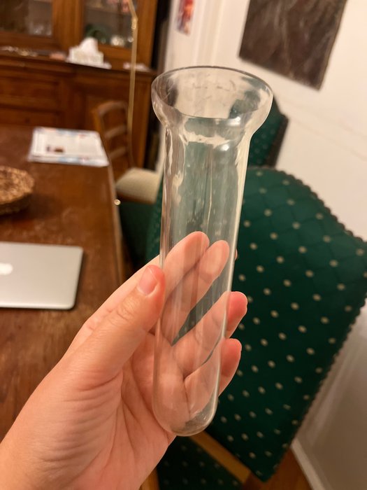 Hij is 50 cm hoog en 20 cm breed (van het grootste deel van het glas tot de ijzeren tak).