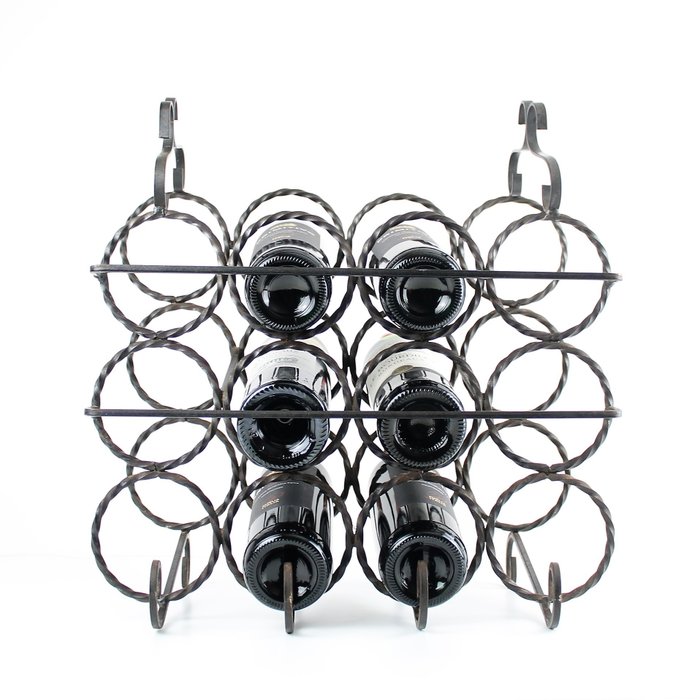 Dit is een zeer degelijk gietijzeren van bijna 4 kg. Het wijnrek bied plaats voor 12 flessen. Getoonde wijnen / flessen behoren NIET tot het kavel.