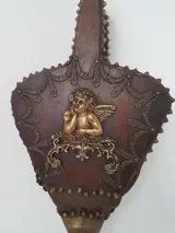 Aan de achterkant boven missen 2 koperen nagels en het ophangbandje.