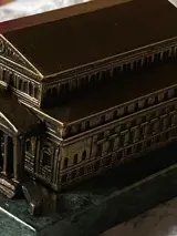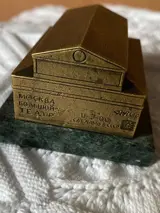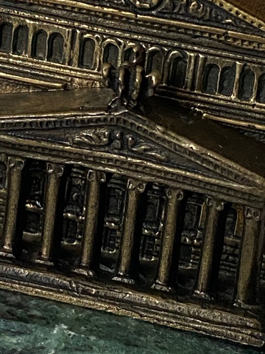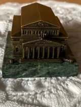 Zeer zeldzame miniatuurbouw van het Bolshoi Theater in Moskou, Rusland, historisch huis van het wereldberoemde Bolshoi Ballet en Opera. Dit souvenirgebouw is gebouwd in de voormalige Sovjet-Unie in de jaren 70 en 80 en de achterkant is in het Russisch gegraveerd met de beruchte CCCP en andere Cyrillische tekens. Dit miniatuurgebouw is gemaakt van messing met uitstekende scherpe details, van de quadriga boven de neoklassieke zuilengevel tot de ramen en het metselwerk aan de zijkanten. Het staat op een groen marmeren sokkel. Een zeldzame schat voor je souvenirbouw- of balletcollectie. Win het met uw bod.