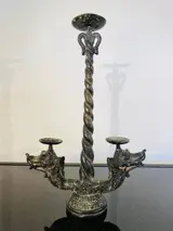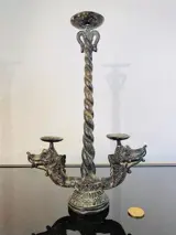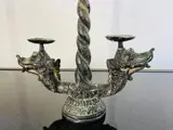 'Naga Busuki' gegoten bronzen drakenkandelaar. De Naga Busuki was de drakenbewaker van de heilige berg Meru op Bali. De schoonheid van het stuk is eenvoud van stijl en is precies wat deze driepuntige kandelaar zo aantrekkelijk maakt. De bijna gotische look bestaat uit twee sierlijk gestileerde draken met in elkaar verstrengelde staarten die eigenlijk de centrale houder vormen.