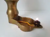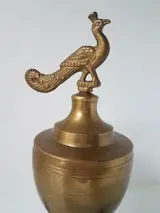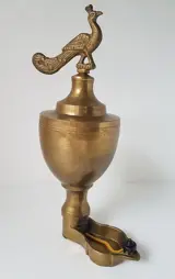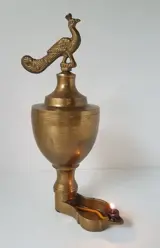Bijzondere olielamp met aan de top een pauw.