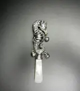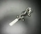 Fraai handgemaakt Sterling zilveren rammelaar van eerste gehalte zilver (925/1000). De rammelaar is uitzonderlijk fraai gedetailleerd gemaakt in de vorm van een zeepaardje met ogen van smaragd (groen).