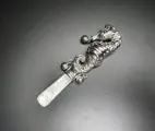 Tevens voorzien van een mooie gave parelmoer handgreep en 3 zilveren rinkelbellen. De rammelaar bevindt zich in uitstekende conditie (zie foto's).