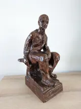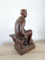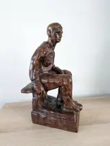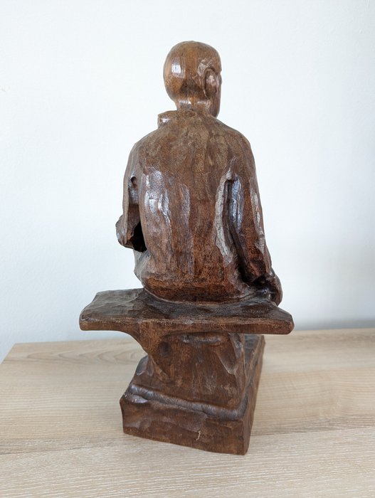 Naïef handgestoken beeld van een zittende man, fraai staaltje robuuste volkskunst. De man heeft een excentrieke voldane gezichtsuitdrukking, een rustmoment na inspanning. Het is opmerkelijk hoe de maker grof en verfijnd werk feilloos afwisselt, vergelijk de linker laars maar eens met het gezicht!