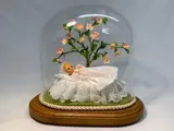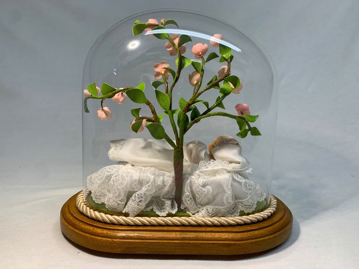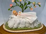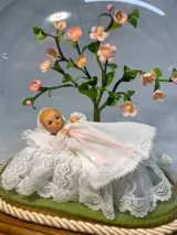 Prachtig beeldje van een kindje in doopkleed onder een bloesemboom, gemaakt door de zusters Clarissen in Turnhout: volledig met de hand gemaakt en afgewerkt met Turnhoutse kant.