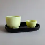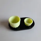 Een eierdopje, zoutvat en onderschotel uit de serie ontbijtserviezen Colopal van A.D. Copier, Glasfabriek Leerdam.