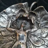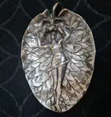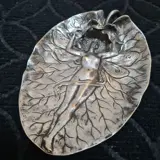 Schitterende Art Nouveau lege zak- of visitekaartjeshouder in verzilverd brons, voorstellende een jonge libelvrouw liggend onder een waterleliebloem in reliëf.