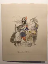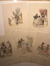 Gegarandeerd originele afdrukken vanaf ca. 1900 door Adolphe Willette, een van de meest geliefde en productieve grafische kunstenaars van Frankrijk. Gekleurde prenten met een militair thema maar de bestemming is mij onbekend. Het kunnen menukaarten zijn of illustraties uit een boek dat als extra suite is gedrukt. Gedrukt op zwaar papier met gekartelde randen. Gravures met hand- of sjabloonkleuring. Heel goede staat.
