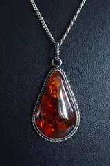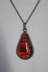 Mooie design hanger met ovale cognackleurige amber, omlijst met een koord decoratie.