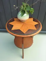 Fraai vorm gegeven Amsterdamse school bijzet of planten tafel met prachtig ingelegd tafelblad.
