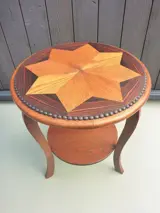 Het ingelegde ster patroon is met contrasterende coromandel en eikenhout fineer afgewerkt, met buitenom een mooie parelrand.