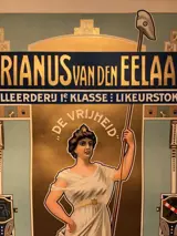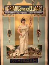 Gegarandeerd originele oude chromolithografische poster voor een likeurproducent uit Schiedam, Nederland. Datering ca. 1900, gedrukt door Lith. Stadler & Sauerbier, Rotterdam. Schiedam stond in die tijd bekend als het “zwarte Nazareth” vanwege het aantal distilleerders in de stad. Goede staat, kleine vlekjes, met de originele metalen ophangstrips.