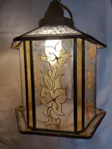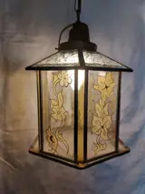 Het lampgedeelte zelf is 29 cm lang en heeft een diameter van 22 cm. De lengte van de lamp inclusief ketting en plafondplaat is 61 cm. Het betreft gegoten oud glas met een beschildering van gele bloemen, waarbij je de oneffenheden in het glas duidelijk kunt voelen. Deze oneffenheden geven het glas door de structuur een mooie glans. Ook boven- en onderop heeft het glas schitterende glasstructuren. EEN LUST VOOR HET OOG!
