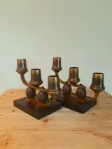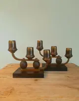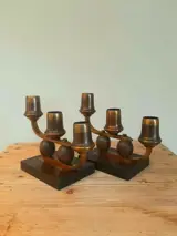 Twee art deco bauhaus kandelaars vanuit Duitsland van omstreeks 1930 vervaardigd met minimalistisch materiaal zoals hout en messing.