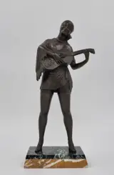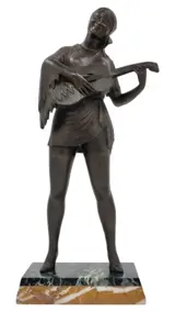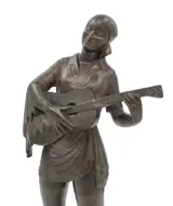 Hoge art-decosculptuur van een dame die gitaar speelt, gegoten in koud geverfd spelter, afgebeeld in een vloeiend, ingewikkeld gedetailleerd kostuum in zigeunerstijl, waarbij elke plooi en beweging perfect is vastgelegd. Allemaal gemaakt om een indruk te geven van de stijl en elegantie die zo typerend zijn voor de Art Deco-periode. Staande op een tweekleurige marmeren standaard.
