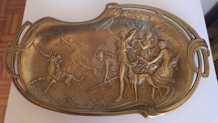 Prachtig art deco dienblad, met een bijzondere baan, van een jacht, van meerdere Diana Huntresses met honden, ook aan de handvatten, en er omheen, zoals te zien op de bijgevoegde foto's, die deel uitmaken van de beschrijving.