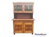 Geweldig patina. Mooie geometrische vorm op de voorste (en achterste!) kastpanelen. De poetsschuif voegt kwaliteit toe, net als de pianoscharnieren op alle kastdeurtjes. 3 sleutels aanwezig, het slot op de onderste kast gaat wat moeilijk. Gezwarte gebieden op panelen boven en op voeten. De conditie is goed in overeenstemming met de leeftijd. Er zijn plekken waar het hout versleten is en er zijn een paar vlekken en krassen. De foto's maken deel uit van de beschrijving.