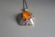 Prachtige Art Deco hanger met een fraaie grote honing kleurige amber en rondom een gestileerde geometrische decoratie.