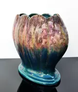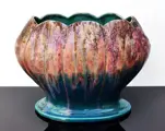 De jardinière heeft een prachtige druipglazuur van een meer dan behoorlijke kwaliteit in bijzonder mooie kleuren uit de jaren 1920-1930 en verkeert in een algemene zeer goede staat. Een kleine haarlijn aan de binnenzijde. Zie laatste foto. De foto's maken deel uit van de beschrijving.