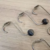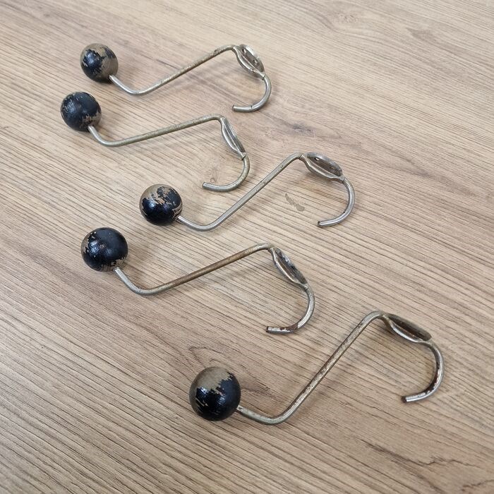 Set van vijf kapstokhaken in Art Deco stijl. De haken zijn van ijzer vervaardigd met houten knoppen. Het metaal en het hout is door de jaren heen licht gepatineerd. De datering ligt in de jaren 1920/30.