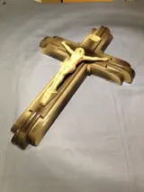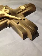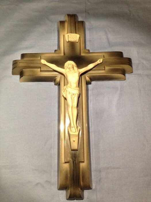 Prachtig en groot kruis in art deco keramische stijl "wolkenkrabber" periode 1940/50, deze bouwstijl heeft veel gebouwen geïnspireerd "chrysler building new york" is een mooi voorbeeld, maar ook veel kerken over de hele wereld ex: "church of the raincy in frankrijk of de kerk van boston ", deze stijl inspireerde ook het meubilair, de lamp, keramiek ect ..... Het kruis is in goede staat opgemerkt een gebrek aan e-mail aan een van de zijkanten van de onopvallende Christus, 70 cm hoog , 47 breed , fabricage arfvnair frankrijk.