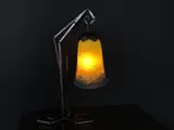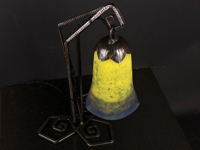 Het wordt bekroond door een prachtige tulp in glaspasta met de toevoeging van het technische veelkleurige emailpoeder dat typisch is voor de glasblazer Jean NOVERDY uit Dijon (rond 1930).