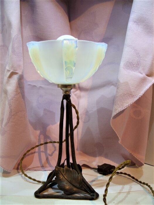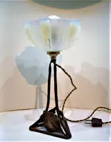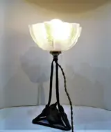 Een zeer fraai art deco lampje met smeedijzer montuur en dik blauwig glas.