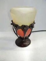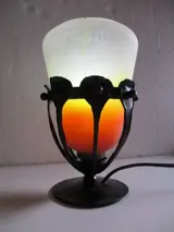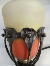 Art Deco-periode nachtlampje circa 1915-1920. Smeedijzeren frame met een dessin van gestileerde bladeren en bolletjes. Opaline glaswerk dat wit en felrood is geverfd om eruit te zien als glaspasta. Oude tulp in goede staat zonder duidelijk merkteken of handtekening. Geëlektrificeerde lamp met grote voet bajonet fitting, nieuwe draad. In goede staat, geen breuk, barsten of restauratie. Totale hoogte 16cm. Basis 8 cm doorsnee. Tulp 12cm hoog en ongeveer 10cm in doorsnee. Totaal gewicht bijna 0,6 kg