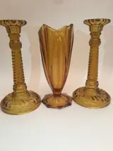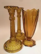 Twee Art Deco persglazen kandelaars en een vaas / glazen kandelaars, toegeschreven aan Durover of Scailmont in België / amberkleurig glas, wervelpatronen, dubbel / paar