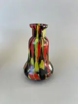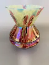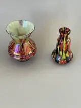 Twee art deco vazen, de eerste in glas met iriserende insluitsels, de hals met een diameter groter dan de voet in de vorm van pauwenveerkleuren, in goede staat, let op een klein chipje aan de hals, zie laatste foto's. Afmetingen / hoogte /. 11 Cm breedte/. 9 Cm. De tweede in troebel glas van verschillende kleuren in de vorm van een kalebas, goede staat, hoogte /. 11 cm breed/. 6 Cm. De foto's dienen als beschrijving zorgvuldige verpakking