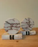 Art deco Bauhaus boekensteunen of schouwornamenten afkomstig uit België tegen de Duitse grens circa 1920. De boekensteunen met typische bauhaus vormen zoals rechte hoeken en cirkels zijn volledig vervaardigd uit marmer. Bij deze uitvoering zijn verschillende soorten en kleuren marmer gebruikt.