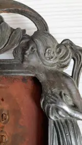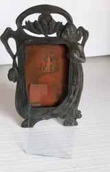 Metalen art nouveau fotolijst met sculptuur van een dame met een bloem in haar hand en golvende vormen in haar haar en jurk kenmerkend voor de Franse "coup de fouet".