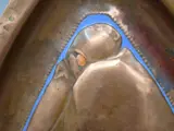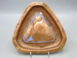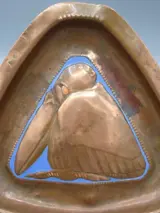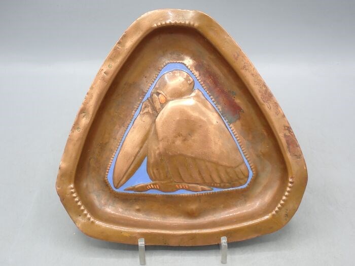 Een prachtige Art Deco vide-poche of asbak, van driehoekige vorm met afgeronde hoeken, repoussé gedecoreerd in het midden met de verhoogde afbeelding van een zittende maribou omgeven door een lichtblauwe geëmailleerde rand binnen een driehoekige reserve. De maribou was een geliefd onderwerp dat werd verwerkt in sculpturen en objecten in art nouveau en art deco.