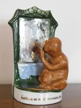 Beeldje of speldenhouder / vaasje van een aap die in de spiegel kijkt. De tekst luidt: Eigenlijk zijn we spiritueel een.