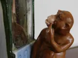 Het beeldje is in goede staat. De spiegel is mooi verweerd en dat geeft de ouderdom goed weer.