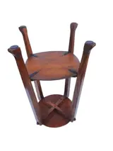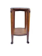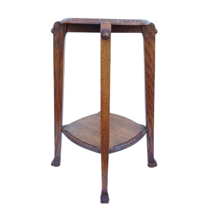 Fraaie rank vormgegeven Amsterdamse school bijzettafel, plantentafel of piedestal vervaardigd uit eiken. Mooie stijlkenmerkende vormgeving aan de randen en poten. Stevig en stabiel, vrij van houtworm. Mis 1 onopvallend klein knopje aan 1 kant, zie foto