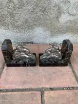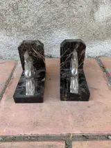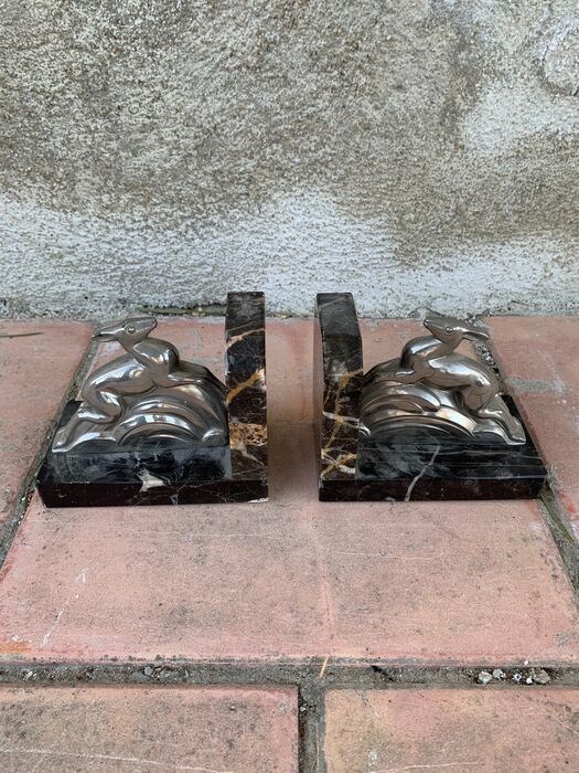 Set van 2 marmeren boekensteunen met een sculptuur van een stalen hert (zie foto's).